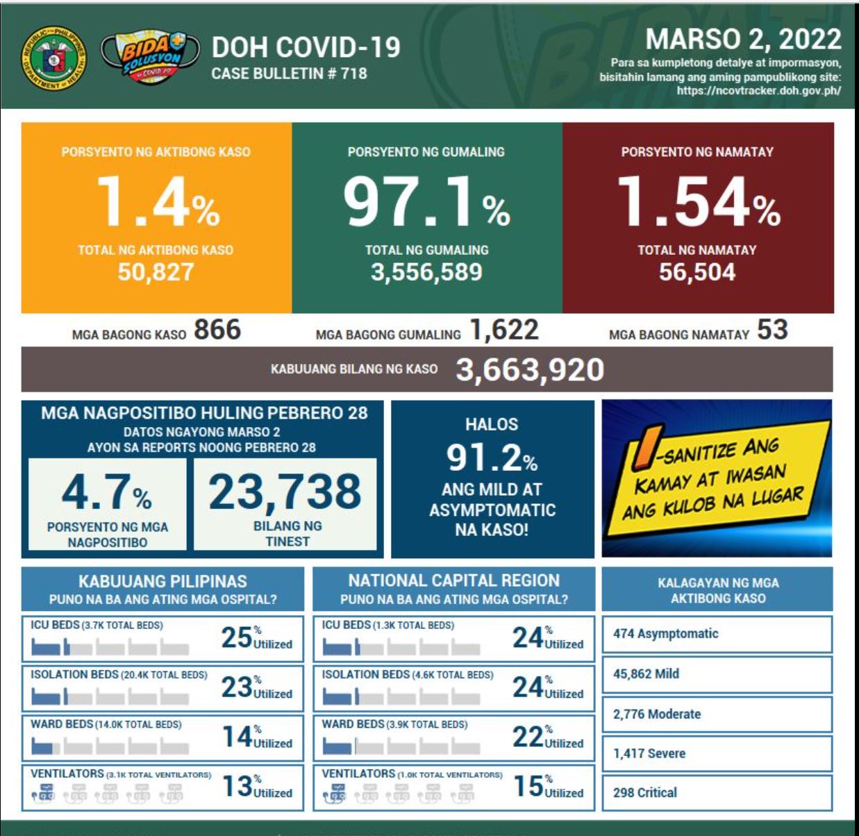 (Eagle News) – The Philippines reported only 866 new Covid-19 cases on Wednesday, March 2, the lowest number of new Covid-19 cases in a day so far this year in the country.