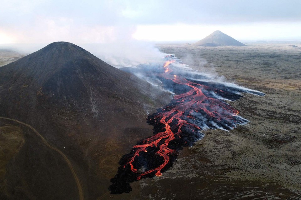 TOPSHOT – This aerial photo taken on July 10, 2023 shows smoke billowing from flowing lava during an volcanic eruption at Litli Hrutur, south-west of Reykjavik in Iceland. A volcano erupted near Iceland’s capital on July 10, 2023, the country’s meteorological office said, marking the third time in two years that lava has gushed out in the area. Local media footage shows a massive cloud of smoke rising from the ground as well as a substantial flow of lava at the site around 30 kilometres (19 miles) from Reykjavik. (Photo by Jeremie RICHARD / AFP)