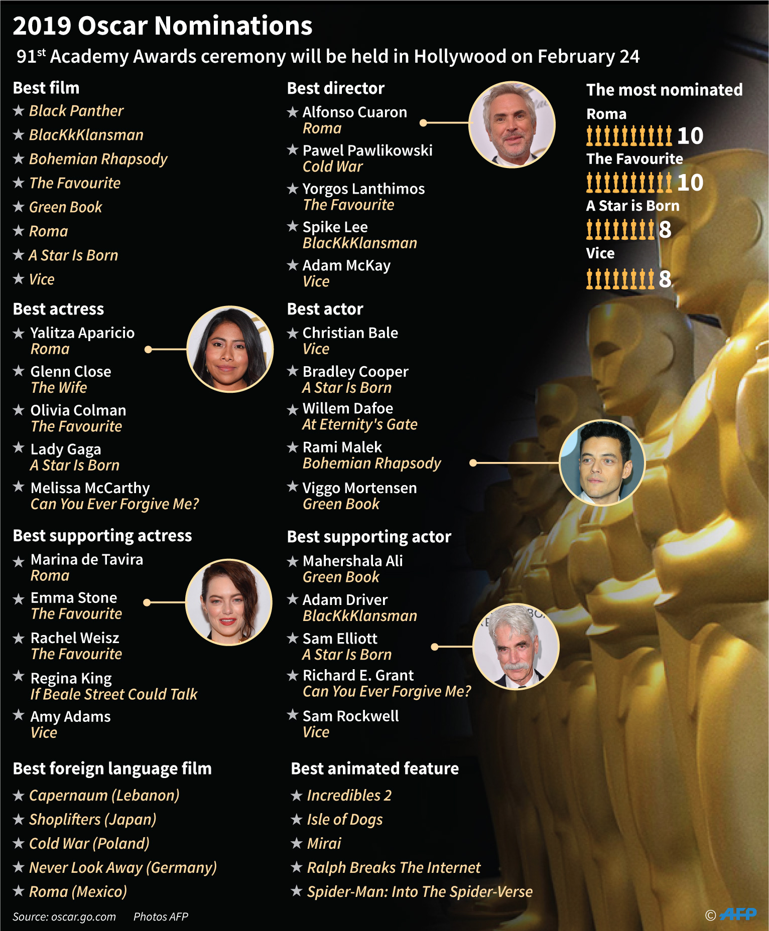 LOS ANGELES, United States (AFP) — The nominations for the 91st Oscars were announced Tuesday, with “Roma” and “The Favorite” leading the pack.