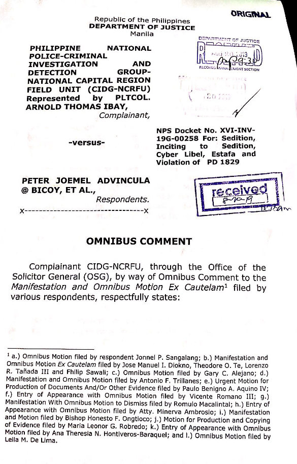 In its 23-page omnibus comment, the OSG said its authority to represent the CIDG was “expressly provided” in Section 35, Chapter 12 of Executive Order No. 292.