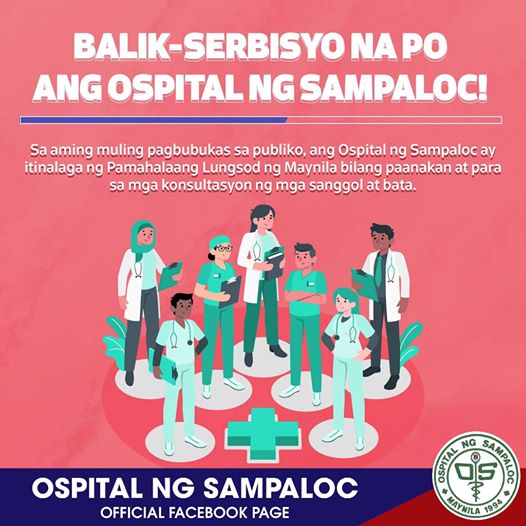 Sa aming muling pagbubukas sa publiko, ang Ospital ng Sampaloc ay itinalaga ng Pamahalaang Lungsod ng Maynila bilang paanakan at para sa mga konsultasyon ng mga sanggol at bata (As we reopen our doors to the public, the Ospital ng Sampaloc has been appointed by the City Government of Manila as  a maternity, infant, and children’s hospital)”, the hospital said in a statement.