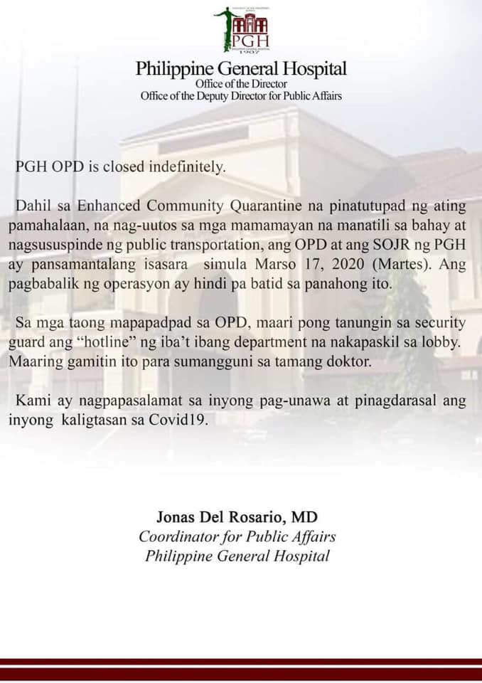 “Dahil sa pagsasara ng PGH Outpatient Department at SOJR Ophthalmology ng PGH, maaari po kayong tu mawag o magtext sa 0935-223-6750 para sa inyong mga katanungan,” the statement said.