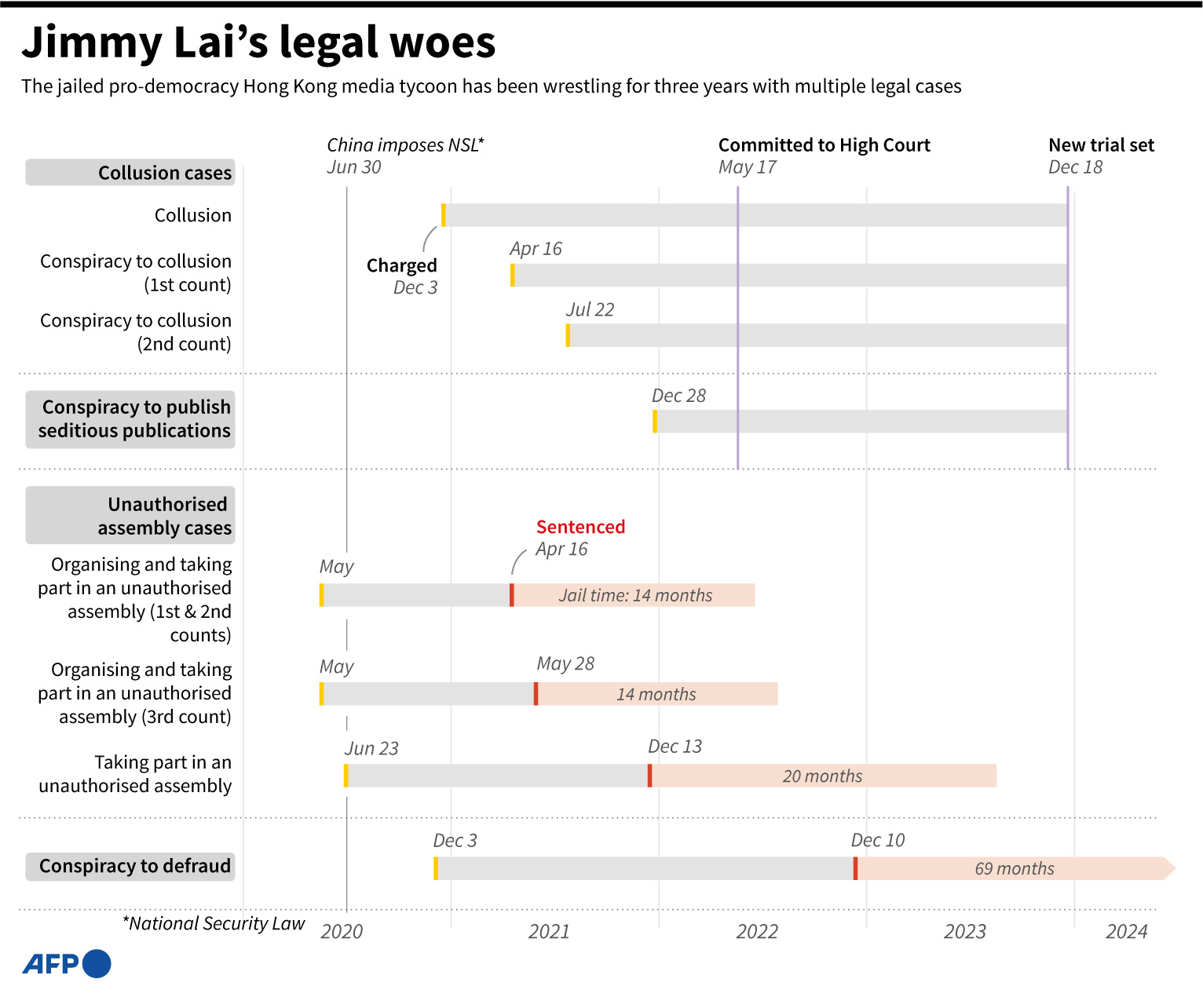 Imprisoned for more than 1,100 days, Lai has already been convicted in five other cases, including for organising and participating in marches during the 2019 democracy protests.