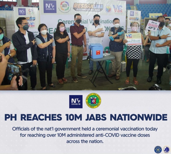 He said that a ceremonial vaccination on the 10 million jabs also happened in Valenzuela City on Monday morning.