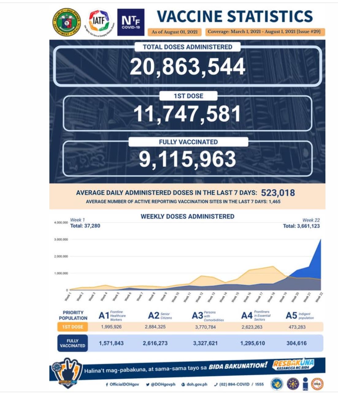 As of Aug, 1, the total doses administered to Filipinos reached 20,863,554. Of this number, 11,747,581 had already received the first dose, while 9,115,963 have received full vaccination. The numbers of those vaccinated are expected to have already breached the 21 million mark by this time if the average daily doses administered is taken into consideration,