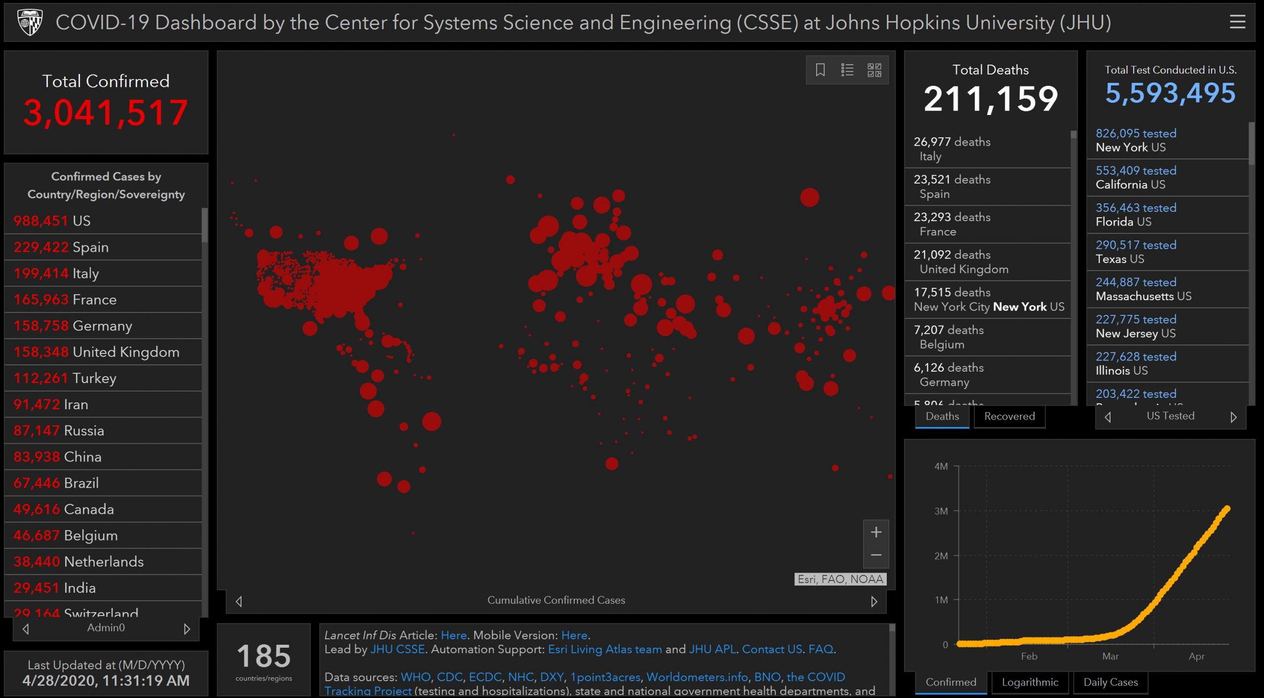 Worldwide, the number of coronavirus cases reached 3,041,764 as of 11:30 a.m., Tuesday, April 28 (Manila time) based on the Johns Hopkins University virus dashboard. Deaths worldwide reached 211,159.