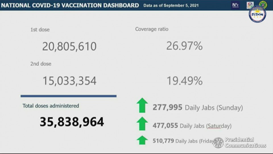 Malacanang said 20.8 million got the initial dose, while 15,033,354 received the full dose or complete vaccination.