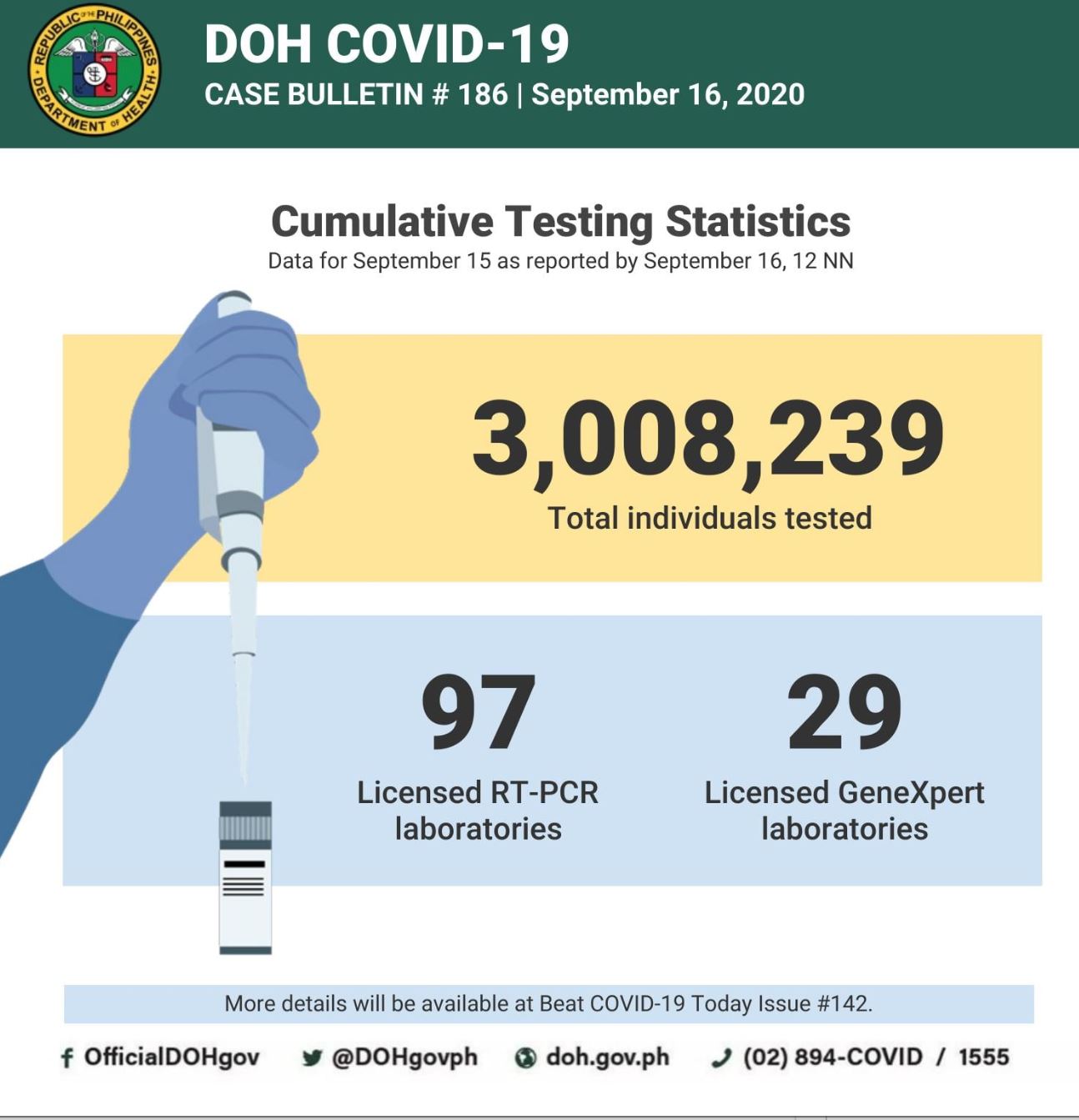 As of Sept. 16, the individuals who have been tested “based on the aggregate reports on the total positive and negative tests from laboratories” have reached 3,008,239.