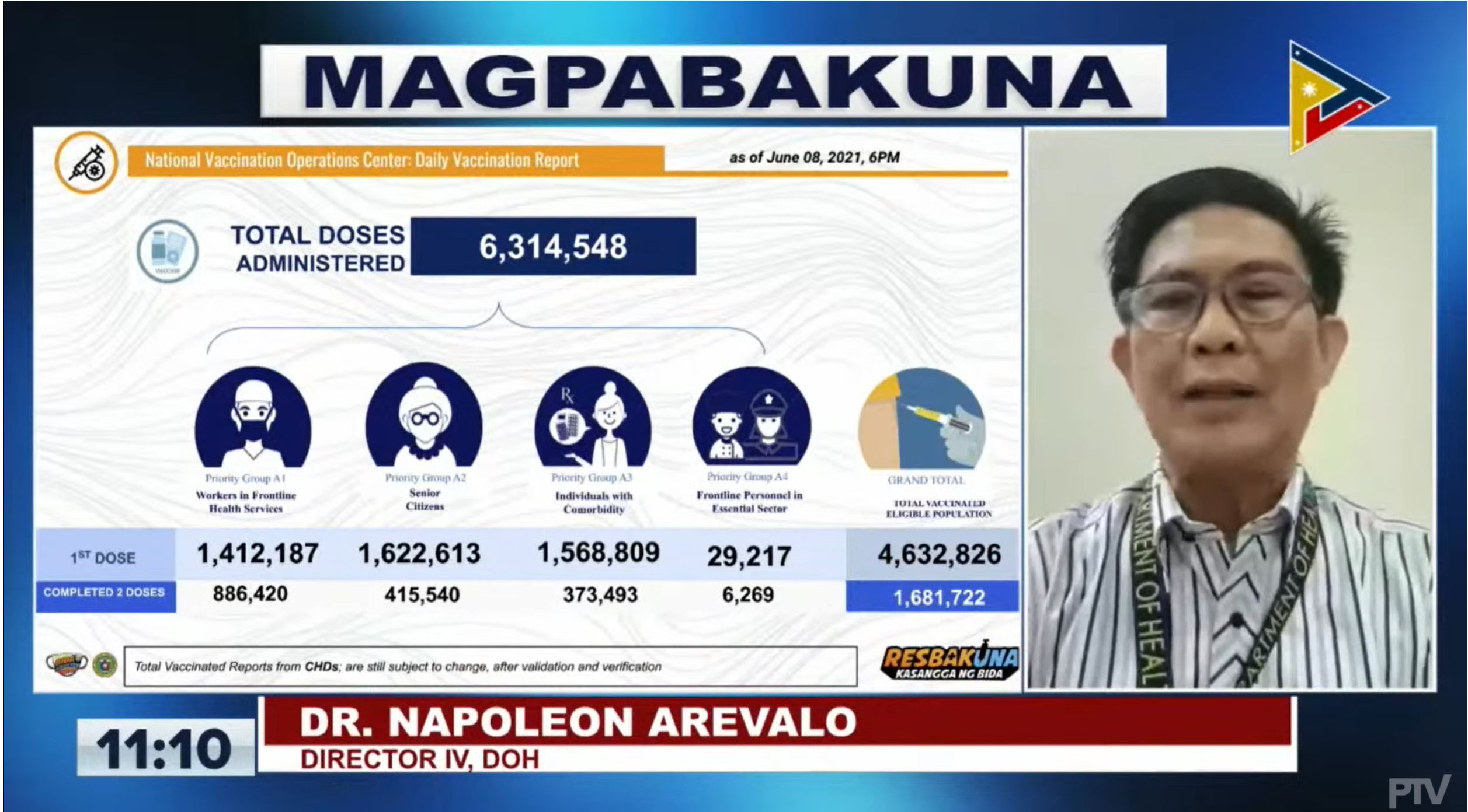 (Eagle News) – Some 6.3 million have already received COVID-19 vaccines in the country, with 1.6 million already receiving both first and second doses, according to a Department of Health official.