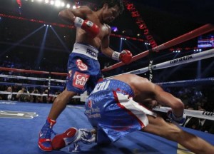 Chris Algieri of the U.S. falls as he takes a punch from Manny Pacquiao (L) of the Philippines during their World Boxing Organisation (WBO) 12-round welterweight title fight at the Venetian Macao hotel in Macau November 23, 2014. REUTERS/Tyrone Siu