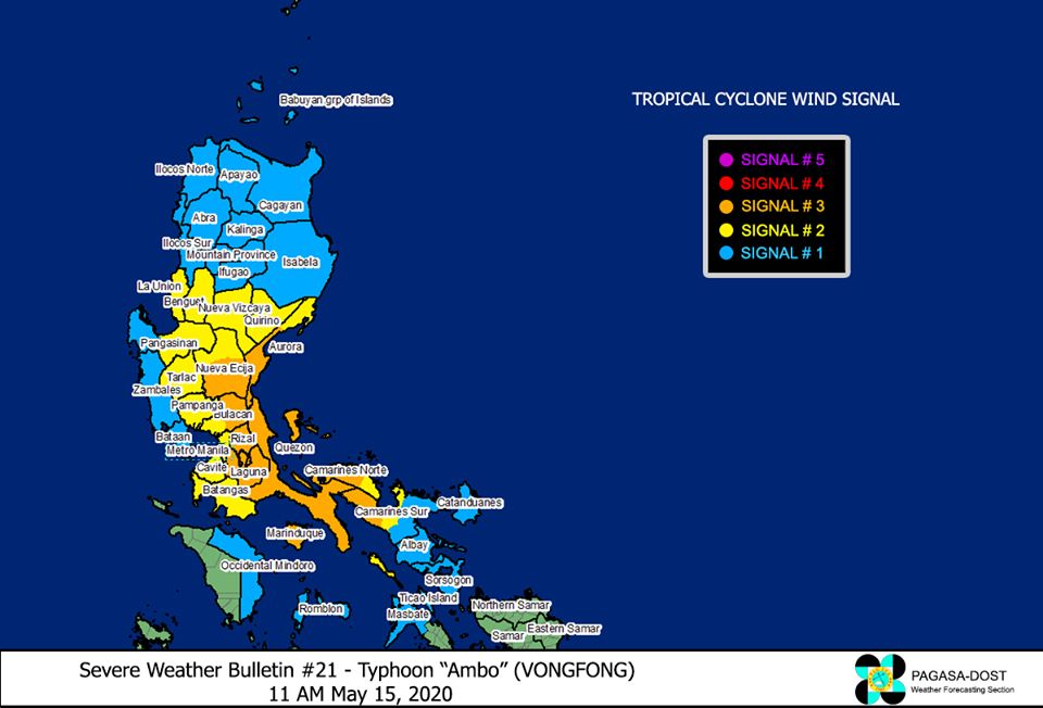 In its 11 a.m. bulletin, PAGASA said moderate to heavy with at times intense rains are expected over Bicol Region, rest of Quezon, Aurora, Marinduque, Laguna, Rizal, Metro Manila, Bulacan, Nueva Ecija, Nueva Vizcaya, and Quirino too, as “Ambo” moves in a northwest direction at 20 kilometers per hour.