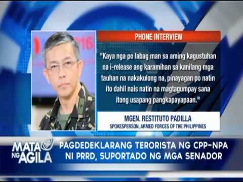 MANILA, Philippines (Eagle News) — Umani ng suporta sa mga senador ang plano ni Pangulong Rodrigo Duterte na ideklara bilang terorista ang Communist Party of the Philippines at ang armed wing nito na New People’s Army.