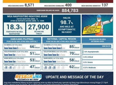 (Eagle News) — Philippine COVID-19 cases reached 884,783 after the Department of Health reported 8571 additional cases on Tuesday, April 13. DOH data said of the total cases, 165534 were active. Of these, 96.9 percent were mild, 1.8 percent asymptomatic, 0.4 percent critical, 0.5 percent were severe, and 0.31 percent were moderate. Recoveries rose to 703963 including the 400 additional ones. The death toll is now at 15285, including the 137 additional ones. The Philippines […]