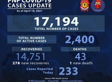(Eagle News) — Over 200 more COVID-19 cases were reported among police personnel. The Philippine National Police said the additional 233 cases pushed the PNP COVID-19 total to 17194. Of these, 2400 were active. Over 200, or 278, additional recoveries were also reported, pushing the PNP recovery tally to 14751. An additional death was reported, bringing the PNP COVID-19 death toll to 43. Earlier, the PNP said PNP Chief Debold Sinas was among those who […]
