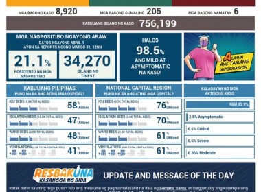 (Eagle News) — Philippine COVID-19 cases reached 756,199 on Thursday, April 1, after the Department of Health reported 8920 additional cases. According to DOH data, of the total COVID-19 cases, 138948 were active. Of these, 95.9 percent were mild, 2.5 percent asymptomatic, 0.6 percent critical, 0.6 percent severe, and 0.36 percent were moderate. Recoveries rose to 603948 including the 205 additional ones. Six additional deaths pushed the COVID-19 death toll to 13,303. Over the weekend, […]