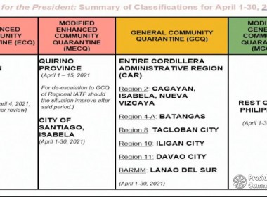 (Eagle News) – More areas are placed under community quarantine protocols with restrictions in the country as the number of single-day cases added to the country had breached 10,000. President Rodrigo Duterte announced that while the Enhanced Community Quarantine (ECQ) protocol is to prevail over Metro Manila or the National Capital Region and the provinces of Bulacan, Cavite, Laguna and Rizal until April 4, it is still “subject to further review.” He also announced […]