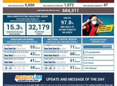 (Eagle News) — Philippine COVID-19 cases reached 684,311 on Wednesday, March 24, after the Department of Health reported 6666 additional cases. According to DOH data, of the total cases, 91754 were active. Of these, 95.3 percent were mild, 2.5 percent asymptomatic, 0.8 percent critical, 0.9 percent severe, and 0.46 percent were moderate. Recoveries rose to 579,518 with the additional 1,072 recoveries. Forty-seven additional deaths pushed the COVID-19 death toll to 13,039. The DOH is currently […]