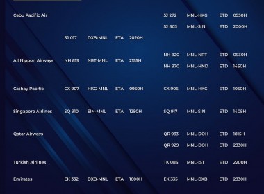 (Eagle News) — The Manila International Airport Authority has released its list of operational commercial flights for Saturday, March 20: MIAA advised passengers to secure confirmation of their flights as only those with the same will be allowed entry into the airport premises. The National Task Force Against COVID-19 has levelled travel restrictions anew, with foreigners, with exceptions, temporarily banned from entering the Philippines. The imposition of the restrictions were amid a surge in COVID-19 […]