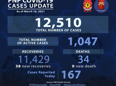 (Eagle News) — The Philippine National Police has reported over 100 additional COVID-19 cases. According to PNP data, the 167 additional cases pushed the PNP COVID-19 active cases to 1,047. Total PNP COVID-19 cases have reached 12,510. Thirty-eight additional recoveries pushed the PNP COVID-19 recovery tally to 11,429. No additional deaths were reported, which means the PNP COVID-19 death toll remains at 34. On Tuesday, the PNP announced the special quarantine of Manila Police District […]