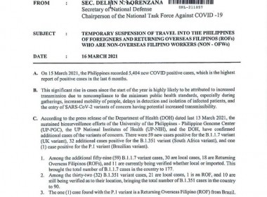 (Eagle News) — The National Task Force Against COVID-19 has suspended the entry of foreigners and returning Filipinos who are non-overseas Filipino workers into the country. According to Memorandum Circular No. 5 s. 2021 signed by NTF chair Defense Secretary Delfin Lorenzana, the suspension, which starts on Saturday, March 20, was amid the “significant rise” in COVID-19 cases at the start of this year, which he said was likely attributed to “increased transmission due to […]