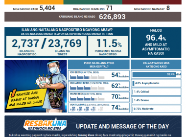 (Eagle News) — Active COVID-19 cases reached 53,479 after the Department of Health reported 5404 additional cases today, March 15, the most COVID-19 cases reported in a single day in seven months. The figure does not include data from five laboratories, and pushed the total COVID-19 cases to 626,893. According to DOH data, of the active cases, 92.4 percent were mild, 4 percent asymptomatic, 1.4 percent critical, 1.4 percent severe, and 0.73 percent were moderate. […]