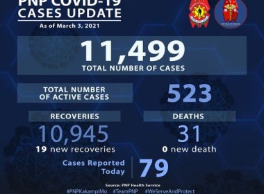 (Eagle News) — Nineteen more police personnel have recovered from COVID-19. The Philippine National Police said the additional recoveries pushed the PNP COVID-19 recovery total to 10945. Seventy-nine additional COVID-19 cases, however, also pushed the PNP COVID-19 tally to 11,499. Of these, 523 are active. The PNP COVID-19 death toll remains at 31, with no additional deaths reported. The Philippines kicked off its COVID-19 vaccination drive on Monday, with some government and medical frontliners given […]