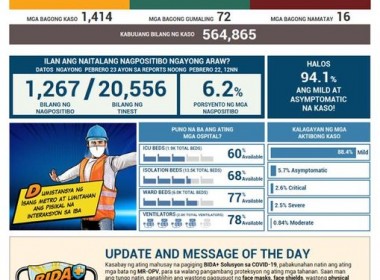 (Eagle News) — COVID-19 cases in the country reached 564,865 after the Department of Health reported 1414 additional cases. The DOH said of the total cases, 29817 were active. Of these, 88.4 percent were mild, 5.7 percent asymptomatic, 2.6 percent critical, 2.5 percent severe, and 0.84 percent were moderate. Seventy-two additional recoveries pushed the COVID-19 recovery total to 522,941. Sixteen additional deaths also pushed the COVID-19 death toll to 12,107. The government is gearing up […]