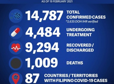 (Eagle News) — COVID-19 cases in the Philippines reached 557058 on Friday, Feb. 19, after the Department of Health reported 1901 additional cases. The DOH said of the total cases, 32440 or 5.8 percent were active. Of these, 86 percent were mild, 8.5 percent asymptomatic, 2.4 percent each were critical and severe, and 0.72 percent were moderate. Over 500, or 537 recoveries, were reported, pushing the COVID-19 recovery total to 557058. Over 100, or 157 […]