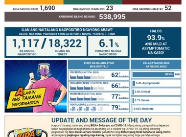 (Eagle News) — COVID-19 cases in the Philippines reached 538,995 after the Department of Health reported 1690 additional cases. The DOH said of the total cases, 27992 or 5.2 percent were active. Of these, 88.5 percent were mild, 5.4 percent asymptomatic, 2.8 percent critical, 2.7 percent severe, and 0.63 percent moderate. Recoveries rose to 499,772 including the additional 23 who recently recovered. Fifty-two additional deaths pushed the COVID-19 death toll to 11231. The government has […]