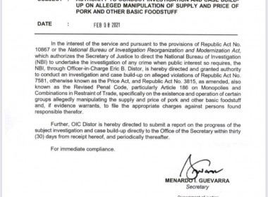 (Eagle News) — Justice Secretary Menardo Guevarra has ordered the National Bureau of Investigation to probe the alleged manipulation of prices of pork and other basic food supplies. Guevarra gave the order to NBI officer-in-charge Eric Distor in Department Order No. 29 released to the media on Monday, Feb. 8. Guevarra ordered Distor to file the necessary charges if evidence warrants. He also ordered him to submit a report on the progress of the probe […]