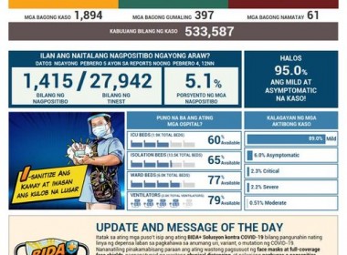 (Eagle News) — COVID-19 cases in the country reached 533,587 after the Department of Health reported 1894 additional cases. The DOH said of the total cases, 34255 or 6.4 percent were active. Of these, 89 percent were mild, 6 percent were asymptomatic, 2.3 percent critical, 2.2 percent severe, and 0.51 percent moderate. Recoveries rose to 488274 including the 397 additional ones. The COVID-19 death toll in the country is now at 11058, including the 61 […]