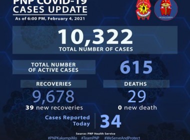 (Eagle News) — Thirty-seven more police personnel have recovered from COVID-19. The Philippine National Police said the additional recoveries pushed the PNP COVID-19 recovery total to 9678. Thirty-four additional cases, however, also pushed the PNP COVID-19 tally to 10322. Of these, the PNP said 615 were active. No additional COVID-19 deaths among PNP personnel were reported, which means the PNP COVID-19 death toll remains at 29. The government has said it was targeting COVID-19 vaccination […]