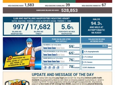 (Eagle News) — COVID-19 cases in the Philippines reached 528,853 on Tuesday, Feb. 2, after the Department of Health reported 1583 additional cases. The DOH said of the total cases, 30368 or 5.7 percent were active. Of these, 89 percent were mild, 5.3 percent asymptomatic, 2.7 percent critical, 2.5 percent were severe, and 0.54 percent were moderate. Thirty-nine additional recoveries pushed the total number of recoveries to 487,611. Sixty-seven deaths pushed the COVID-19 death toll […]
