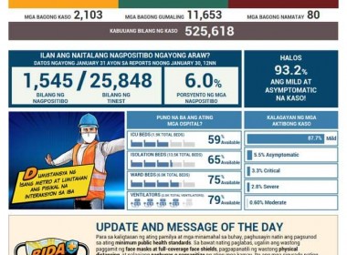 (Eagle News)–COVID-19 cases in the country reached 525,618 on Sunday, Jan. 31, after the Department of Health reported 2103 additional cases. Of the total cases, the DOH said 27318 or 5.2 percent were active. Of these, 87.7 percent were mild, 5.5 percent asymptomatic, 3.3 percent critical, 2.8 percent severe and 0.6 percent were moderate. Recoveries rose to 487551 including the 11653 additional ones. Eighty additional deaths pushed the death toll due to COVID-19 to 10749. […]
