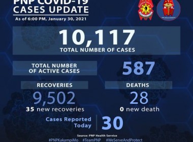 (Eagle News) — Thirty-five more police personnel have recovered from COVID-19. The Philippine National Police said the additional recoveries pushed the PNP COVID-19 recovery tally to 9502. Thirty additional cases, however, pushed the PNP COVID-19 tally to 10,117. Of these, 587 were active. No additional deaths were reported, which means the PNP COVID-19 death toll remains at 28. The police are among the priorities in a COVID-19 national vaccination program that is slated to start […]