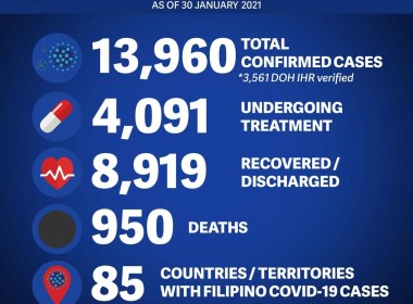 (Eagle News) — Twenty-two more overseas Filipinos have tested positive for COVID-19. The Department of Foreign Affairs said the additional COVID-19 cases pushed the COVID-19 total among Filipinos abroad to 13,960. No additional recoveries nor fatalities were reported, which means the COVID-19 recoveries and deaths among Filipinos outside the country remain at 8919 and 950. “Compared to last week’s percentages, the total number of COVID-19 fatalities and recoveries saw a slight decrease to 6.81% and […]