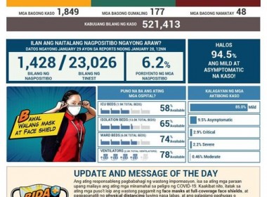 (Eagle News) — COVID-19 cases in the country reached 521,413 on Friday, Jan. 29, after the Department of Health reported 1,849 additional cases. The DOH said of the total cases, 35,048 were active. Of these, 85 percent were mild, 9.5 percent asymptomatic, 2.9 percent critical, 2.2 percent severe, and 0.46 percent were moderate. The DOH data did not say which areas reported the most COVID-19 cases today. Recoveries rose to 475,765 including the 177 additional […]