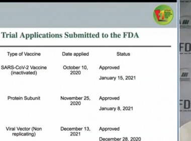 (Eagle News) — The Food and Drug Administration (FDA) said that three clinical trials for COVID-19 vaccines which it had earlier approved are about to begin in the country. These are the Phase 3 clinical trials for the vaccines developed by Janssen Pharmaceuticals of Johnson and Johnson, Clover Biopharmaceuticals, and Sinovac. “So wala na po tayong pending ngayon na mga applications for clinical trials with FDA, and all these three clinical trials have been […]