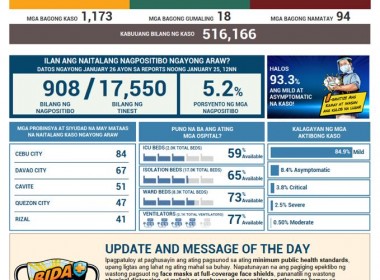 (Eagle News) — COVID-19 cases in the country breached the 516,000 mark on Tuesday, Jan. 26, after the Department of Health reported 1,173 additional cases. The DOH said of the total 516,166 cases, 30,357 were active. Of these, 84.9 percent were mild, 8.4 percent asymptomatic, 3.8 percent critical, 2.5 percent severe, and 0.5 percent were moderate. The areas with the most COVID-19 cases reported today were Cebu City with 84, Davao City with 67, Cavite […]