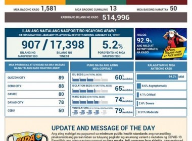 (Eagle News) — COVID-19 cases in the country breached the 514,000 mark on Monday, Jan. 25, after the Department of Health reported 1,581 additional cases. The DOH said of the total 514,996 cases, 29,282 or 5.7 percent were active. Of these, 84.3 percent were mild, 8.6 percent asymptomatic, 4.1 percent critical, 2.6 percent severe, and 0.51 percent moderate. The areas with the most COVID-19 cases reported today were Quezon City with 89, Cebu City with […]