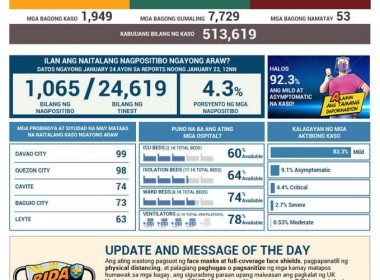 (Eagle News)–COVID-19 cases in the country reached 513,619 on Sunday, Jan. 24, after the Department of Health reported 1,949 additional cases. The DOH said of the total cases, 27,765 were active. Of these, 83.3 percent were mild, 9.1 percent asymptomatic, 2.7 percent severe, 4.4 percent critical and 0.53 percent moderate. The areas with the most COVID-19 cases today were Davao City with 99, Quezon City with 98, Cavite with 74, Baguio City with 73, and […]