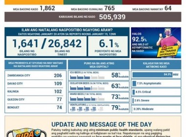 (Eagle News) — COVID-19 cases in the Philippines reached 505,939 on Wednesday, Jan. 20, after the Department of Health reported 1,862 additional cases. The DOH said of the total COVID-19 cases, 5.7 percent or 28,904 were active. Of these, 84.9 percent were mild, 7.5 percent asymptomatic, 4.5 percent critical, 2.6 percent severe, and 0.39 percent were moderate. The areas with the most COVID-19 cases reported today were Zamboanga City with 206, Davao City with 109, […]