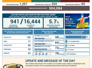 (Eagle News) — The number of COVID-19 cases in the country climbed to 504,084 after the Department of Health reported 1357 additional cases on Tuesday, January 19. The DOH said of the total cases, 27857 were active. Of these, 86.1 percent were mild, 6.1 percent asymptomatic, 4.7 percent critical, 2.7 percent severe, and 0.42 percent moderate. The areas with the most COVID-19 cases reported today were Davao City with 130, Rizal with 71, Quezon City […]