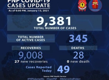 (Eagle News) — Twenty-seven more police personnel have recovered from COVID-19. The Philippine National Police said the additional recoveries pushed the PNP COVID-19 recovery total to 9,008. Forty-nine more cases, however, also pushed the COVID-19 total among police personnel to 9381. Of these, 345 were active. No additional deaths were reported, which means the death toll remains at 28. The government has said uniformed personnel–including policemen–are among the priorities in a COVID-19 national vaccination program […]