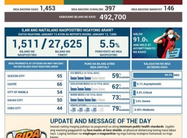 (Eagle News) — COVID-19 cases in the country breached the 492,000 mark on Wednesday, January 13, after the Department of Health reported 1453 additional cases. The DOH said of the 492,700 total cases, 24,478 were active. Of these, 84.9 percent were mild cases, 6.1 percent asymptomatic, 5.5 percent critical, 3 percent severe, and 0.5 percent moderate. The areas with the most COVID-19 cases reported today were Quezon City with 95, Cavite with 66, Manila with […]
