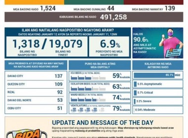 (Eagle News) –COVID-19 cases in the country breached the 491,000 mark on Tuesday, January 12, after the Department of Health reported 1524 additional cases. The DOH said of the total 491,258 total cases, 23,532 were active. Of these, 85.1 percent were mild, 5.5 percent asymptomatic, 5.7 percent critical, 3.2 percent severe, and 0.54 percent moderate. The areas with the most COVID-19 cases reported today were Davao City with 137, Quezon City with 109, Rizal with […]