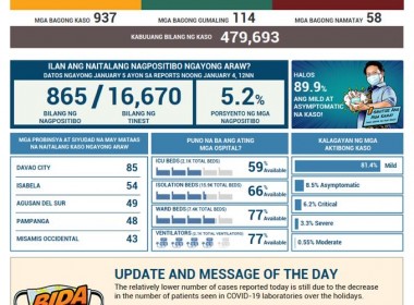 (Eagle News) — COVID-19 cases in the country breached the 479,000 mark on Tuesday, January 5, after the Department of Health reported 937 additional cases. The DOH said of the total 479,693 cases, 21997 were active. Of these, 81.4 percent were mild, 8.5 percent asymptomatic, 6.2 percent critical, 3.3 percent severe, and 0.55 percent moderate. The areas with the most COVID-19 cases reported today were Davao City with 85, Isabela with 54, Agusan del Sur […]