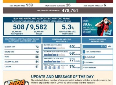 (Eagle News) — COVID-19 cases in the country reached 478,761 on Monday, January 4, after the Department of Health reported 959 additional cases. According to the DOH, the decrease in the number of additional cases reported was due to a decrease in the number of patients seen in COVID-19 laboratories during the New Year. Of the 478,761 total COVID-19 cases, 21,219 were active. Of these, 81.7 percent were mild, 7.9 percent asymptomatic, 6.4 percent critical, […]