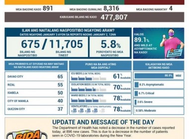 (Eagle News) — COVID-19 cases in the country breached the 477,000 mark on Sunday, January 3, after the Department of Health reported 891 additional cases. The DOH said with of the total 477807 total COVID-19 cases, 20292 were active. Of these, 80.9 percent were mild, 8.2 percent asymptomatic, 6.7 percent critical, 3.6 percent severe, and 0.58 percent moderate. The areas with the most COVID-19 cases reported on Sunday were Davao City with 65, Rizal with […]