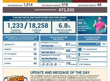 (Eagle News)–COVID-19 cases in the Philippines reached 472,532 on Wednesday, December 30, after the Department of Health reported 1014 additional cases. The DOH said of the total COVID-19 cases, 5 percent or 23793 were active. Of these, 79.7 percent were mild, 11 percent asymptomatic, 5.7 percent critical, 3.1 percent severe, and 0.49 percent moderate. The areas with the most COVID-19 cases reported today were Quezon City with 67, Benguet with 57, Makati with 48, Bulacan […]